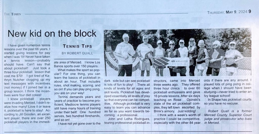 Robert Quall writes the Tennis Tips column for the Merced County Times newspaper. He wrote the following article following clinics that we ran in spring 2024.