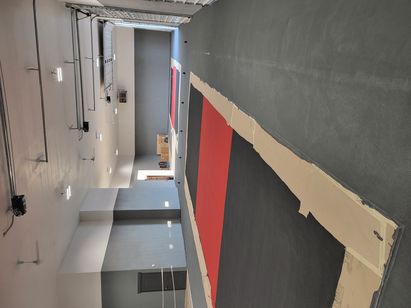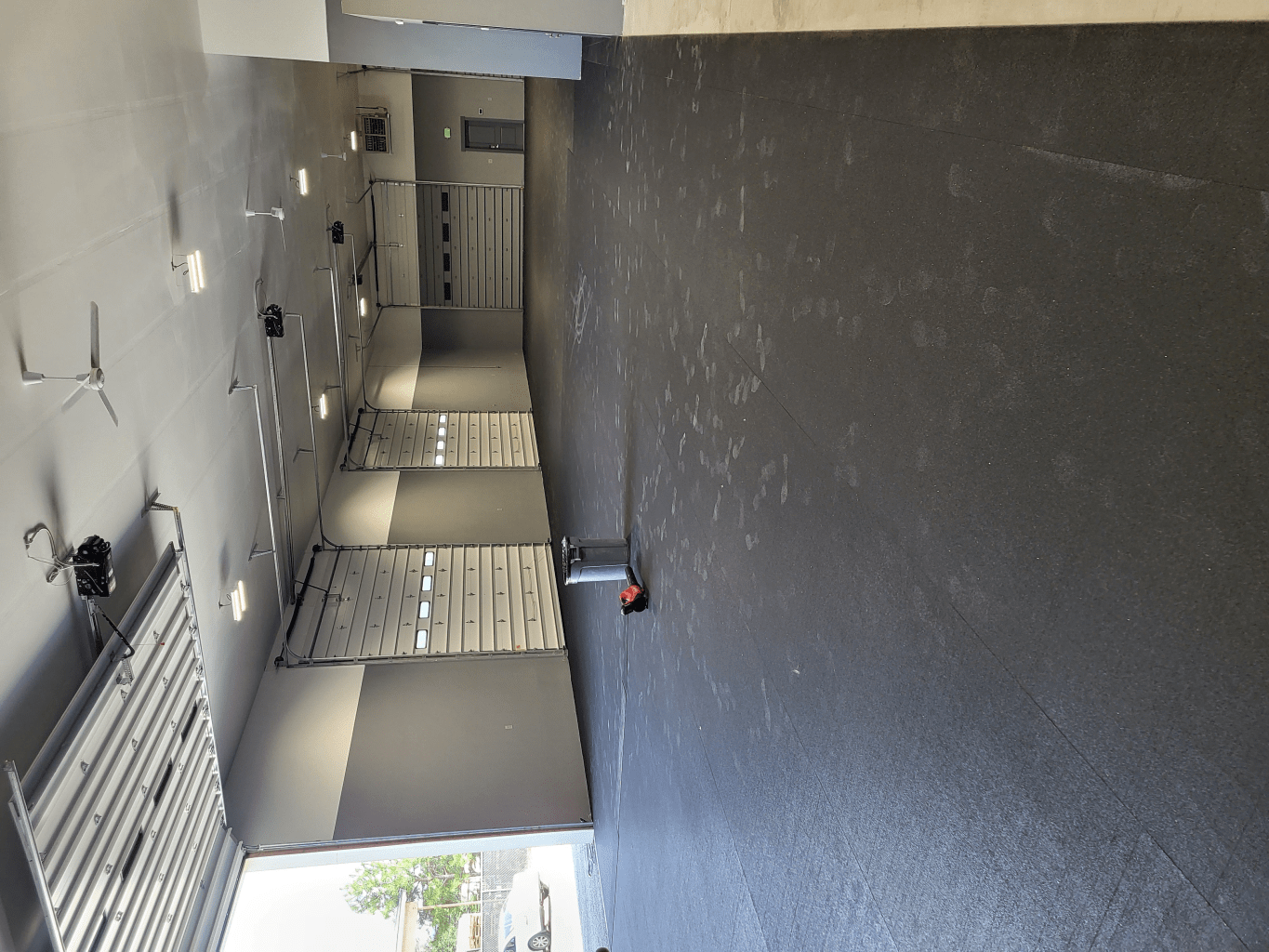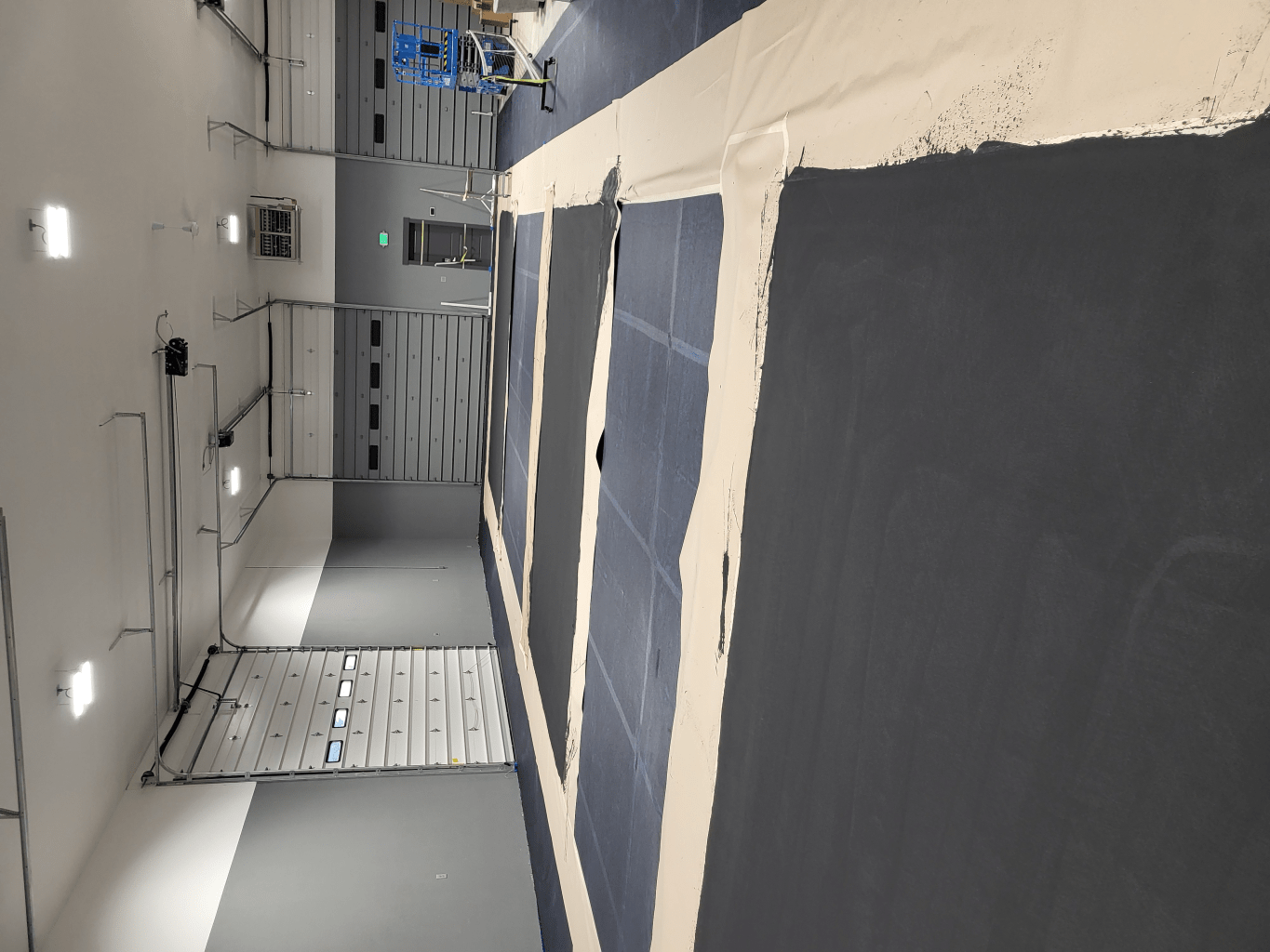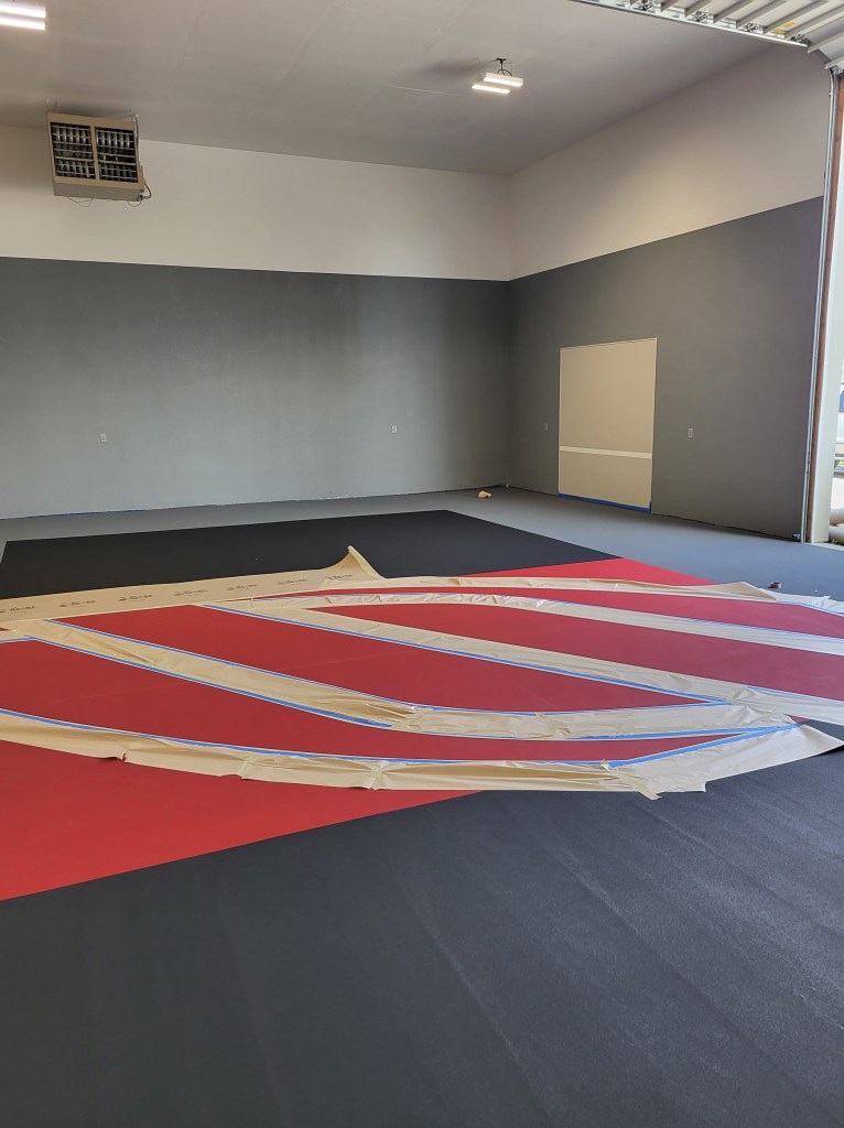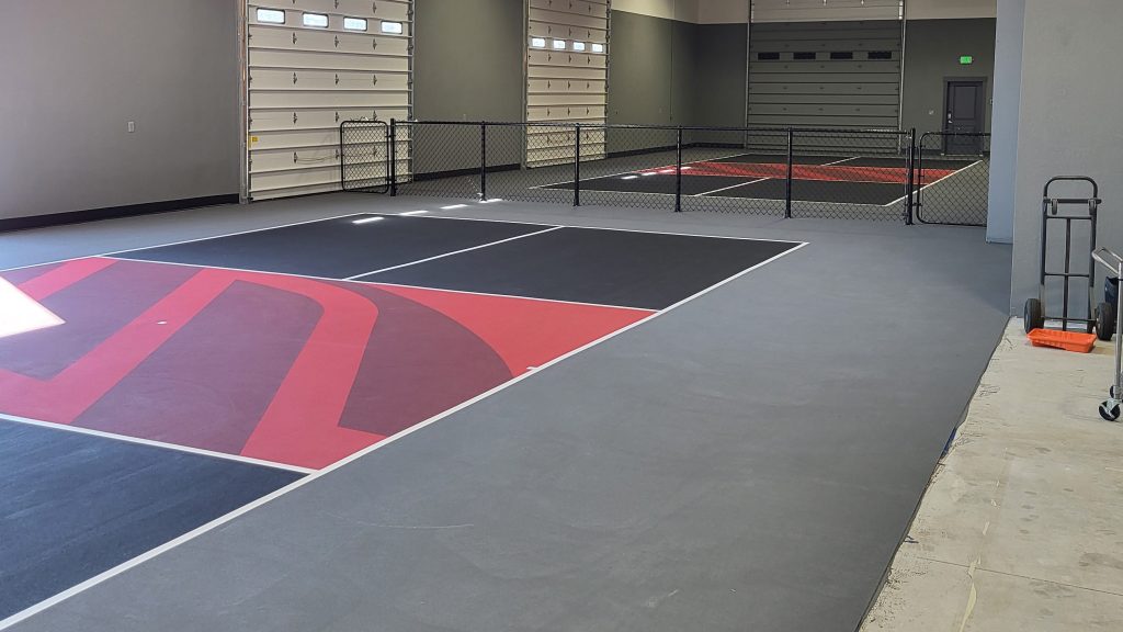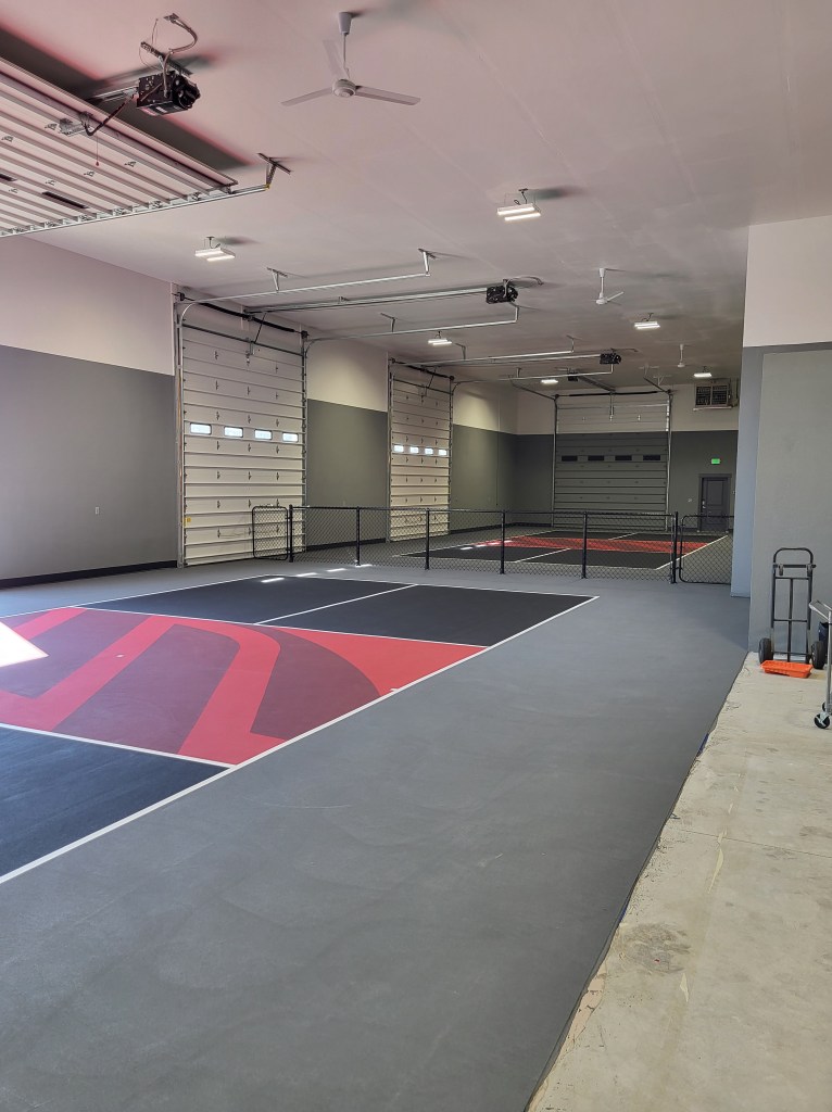 We finished taping and texturing the drywall, along with painting in the first month. The floor was then ground down and pressure washed; this took us into the second month. Once everything was prepped, we glued down the cushioned mat and applied the two coats of acrylic top coats. We then installed the divider fence and gates. Our final step was to install the vinyl flooring on the side of the court.