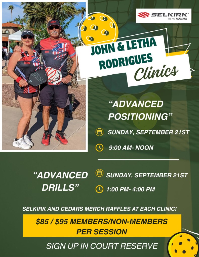 Tracy Dyk from The Cedars Pickleball Club created the following poster for the event. Note that we’ve retitled “Advanced Positioning” to “Strategic Positioning” and re-planned the afternoon session from “Tactical Drills” (f.k.a. “Advanced Drills”) to the “Doubles Strategies” clinic.